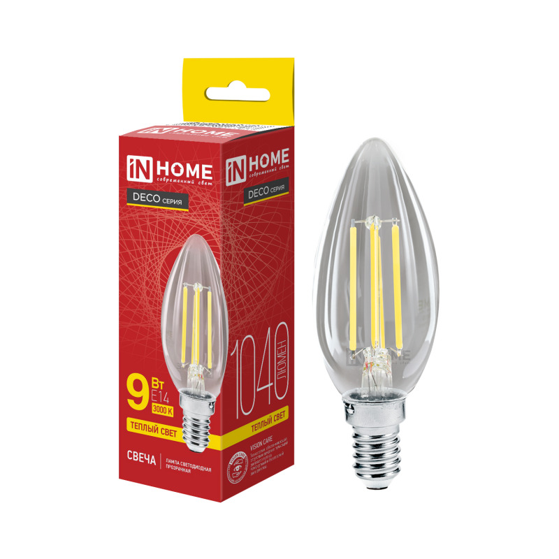 Лампа светодиодная In Home филаментная LED-Свеча-deco 9Вт Е14 3000К 810Лм