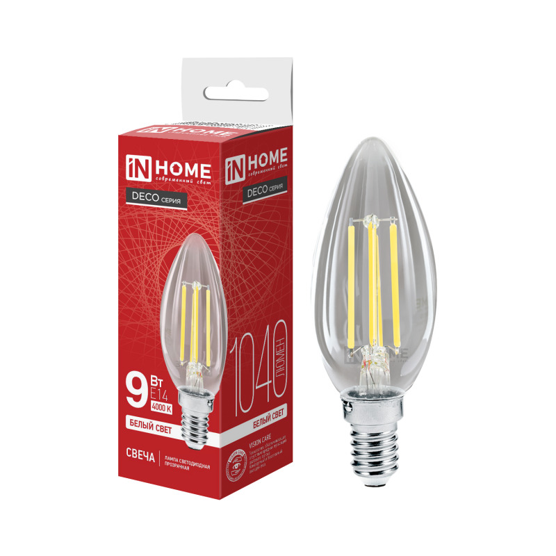 Лампа светодиодная In Home филаментная LED-Свеча-deco 9Вт Е14 4000К 810Лм