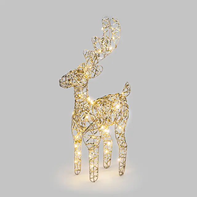 Металлическая 3D-фигура в форме Оленя – это стильный и выразительный декоративный элемент, который украсит интерьер к празднику. Фигура выполнена с особым вниманием к деталям и отличается качественным исполнением. Свечение огоньков наполняет пространство уютом и напоминает о теплых вечерах в кругу семьи и волшебной атмосфере зимних праздников. Светящийся олень идеально дополнит композицию под новогодней елочкой, а также станет отличным акцентом в гостиной или детской комнате. Изделие работает от 3 батареек типа АА в режиме постоянного свечения. Длина провода до батарейного блока: 30 см.Вы просматривали