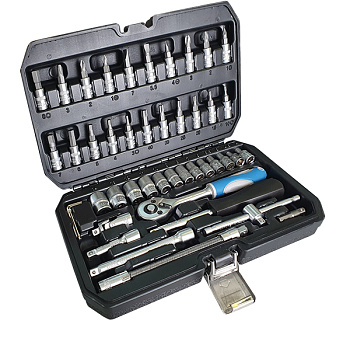 - в состав набора входят: головки торцевые 6-гранные 1/4": 4,4.5,5,5.5,6,7,8,9,10,11,12,13,14мм, ключ трещоточный 1/4", 72 зуба двухкомпонентная рукоятка, удлинитель 1/4": 50 и 100мм,Гибкий удлинитель 1/4", 150мм, карданный шарнир 1/4", вороток Т-образный 1/4", 110мм, отвертка-держатель 1/4", 150мм, шестигранный адаптер 1/4", головки торцевые 1/4" со вставкой: Т10, 15, 20, 25, 30, 40мм, головки торцевые 1/4" со вставкой: HEX 3, 4, 5, 6, 7, 8мм, головки торцевые 1/4" со вставкой: PH 1, 2, 3; PZ 1, 2, 3мм.