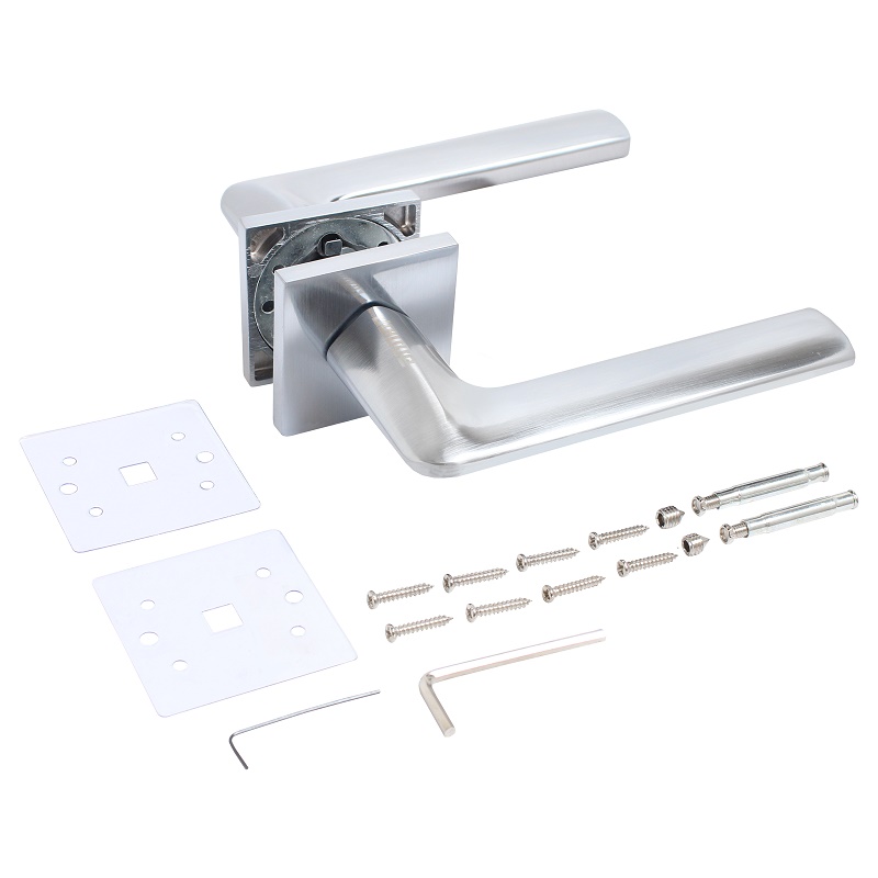 Комплект ручек, подпружиненный на квадратной накладке для деревянных и легких металлических дверей с толщиной полотна 34-45 мм. Аксессуар двери для её ручного открывания, являющийся одним из необходимых элементов дверной фурнитуры. Основная функция дверной ручки (как входной, так и межкомнатной двери)- это управление замком и дверью . Так же играют декоративною роль в помещении.Вы просматривали
